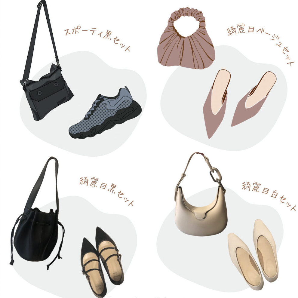 白い靴と白い鞄、黒い靴と黒い鞄、スニーカーとサコッシュ、バレエシューズとカゴバックのように、相性の良い者同士をセットで買っておくと、なんてことないシンプルな服に合わせるだけであか抜けます。