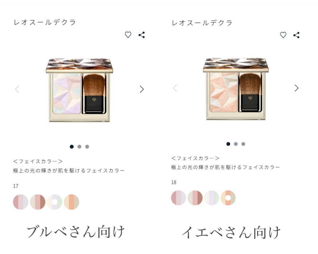 ブルベさんには青味のある17を。イエベさんには黄味のある18を使用しています。細かい光の粒が本当に綺麗で、お肌に透明感とツヤを生み出してくれます。