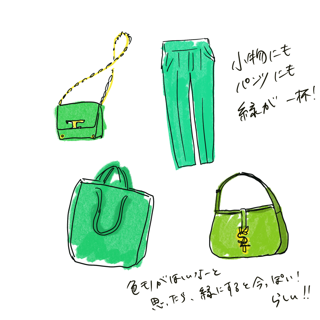 バッグでも、靴でも、スカーフでも良いので、緑をプラスワンすると一気に旬になります。
