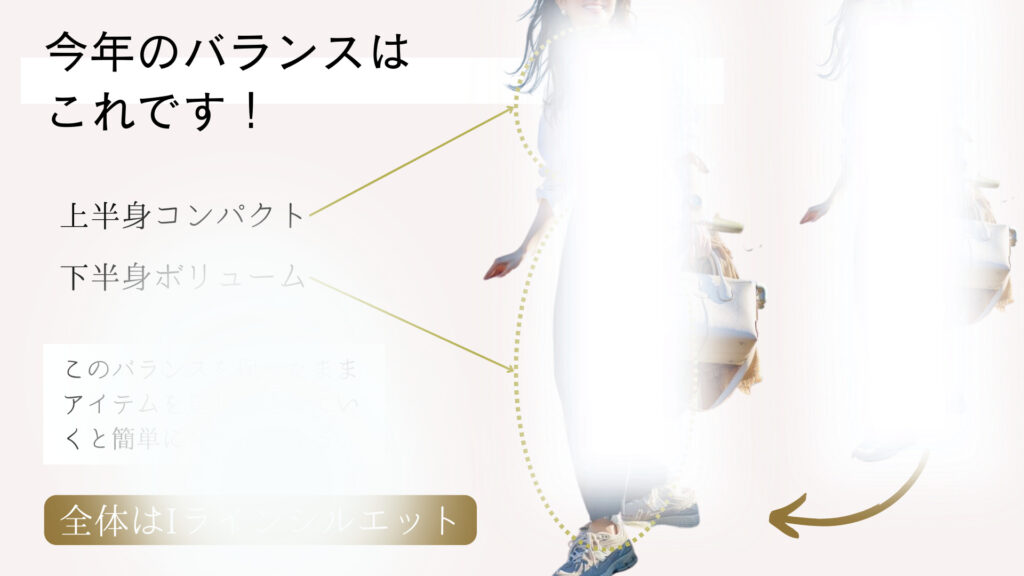 ショート丈のトップスが流行るから、ボリュームのあるボトムスが出て来るし、Iラインシルエットが旬だからIラインを作るジレやジャケットが流行ります。