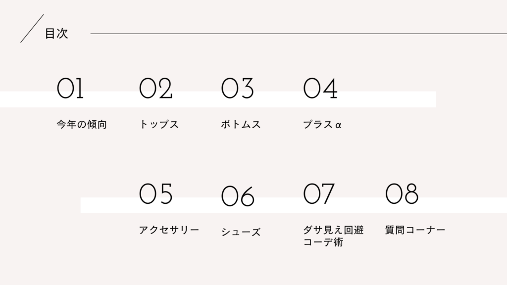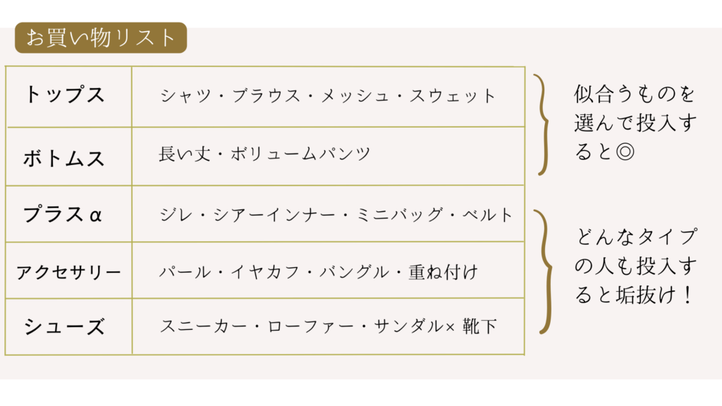 トップス、ボトムス、プラスαアイテム、アクセサリー、シューズをそれぞれ個別具体に解説しました。