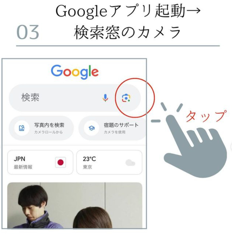 STEP3 グーグルアプリを起動して検索窓にあるカメラマークをタップ