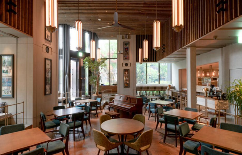 浜町ホテル自体も植物に覆われた特徴的な外観で人気です。1階のこちらは広々としたスペースでランチを楽しめます。