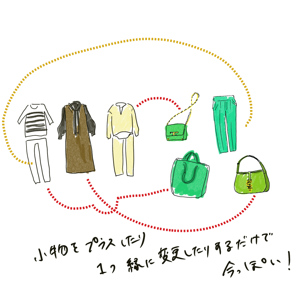サンダルだけ、バックだけなど、ワンポイントでトレンドカラーのものを買い足して、今までのコーデにプラスしていくやり方なども良いかなと思います。