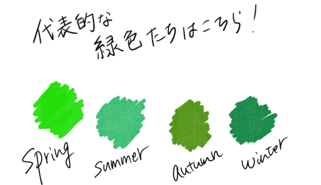 例えば今年流行りのグリーンだと、同じ緑色でもパーソナルカラー別にお勧めの色味が変わります。