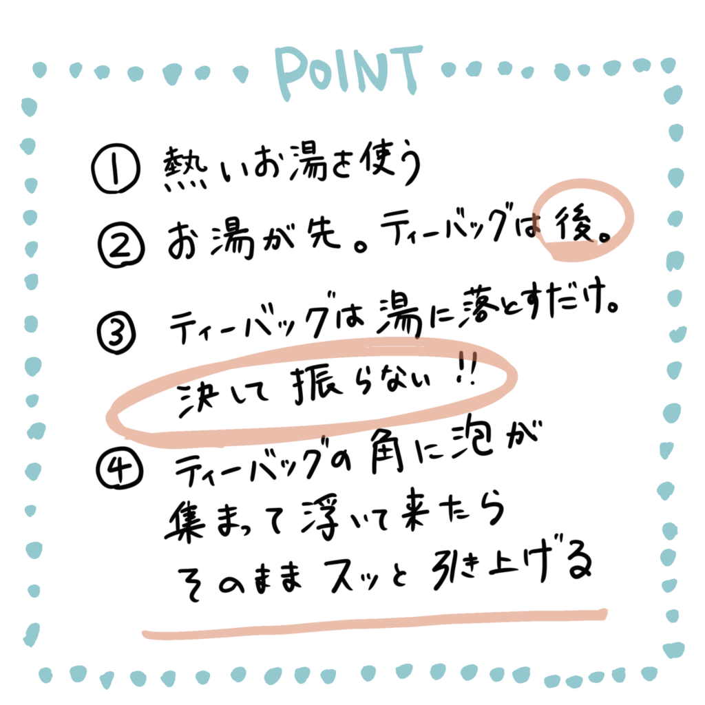 ティーバックをお湯から引き上げるタイミングは、茶葉から出た泡(アクなんだそうです)がティーバックの一角に集まって、バックの先がチョンと水面に浮き上がったら、そのまま引き上げるだけ。