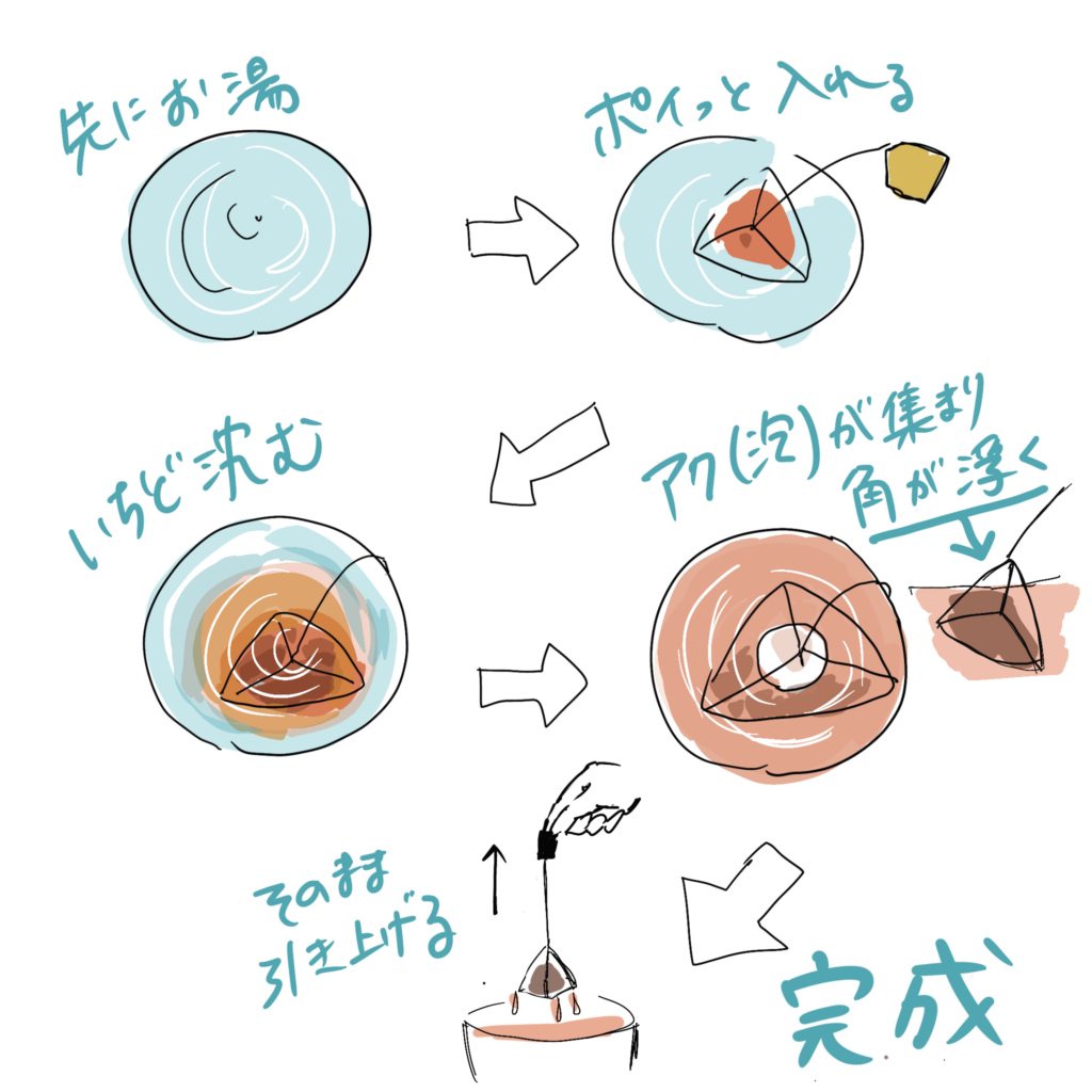 早くお茶を淹れようと、お湯の中でバックを左右に揺らしていたのですが、それがNGだと習いました。